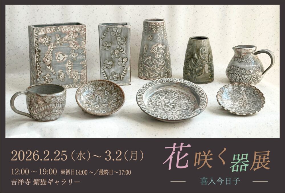 「花咲く器ー喜入今日子ー」陶器展 開催日 2026年2月25日(水)~3月2日(月) 時間 12:00~19:00(初日14:00、最終日17:00まで) 会場 錆猫ギャラリー〒180-0004 東京都武蔵野市吉祥寺本町2-33-1 Web https://sabineko-gallery.com/?p=24060