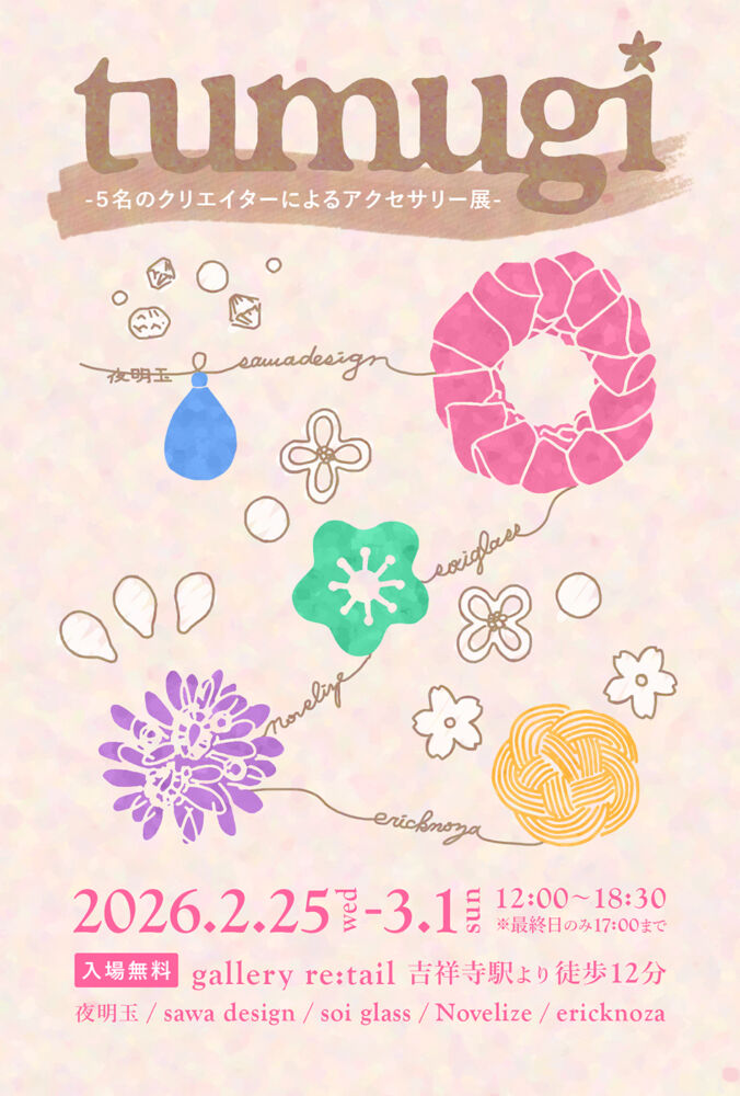 tumugi -5名のクリエイターによるアクセサリー展- 開催日 2026年2月25日(水)〜3月1日(日) 時間 12:00~18:30(最終日17:00まで) 会場 gallery re:tail〒180-0004 東京都武蔵野市吉祥寺本町3-12-9 潤マンション103 Web http://thetail.jp/archives/16801