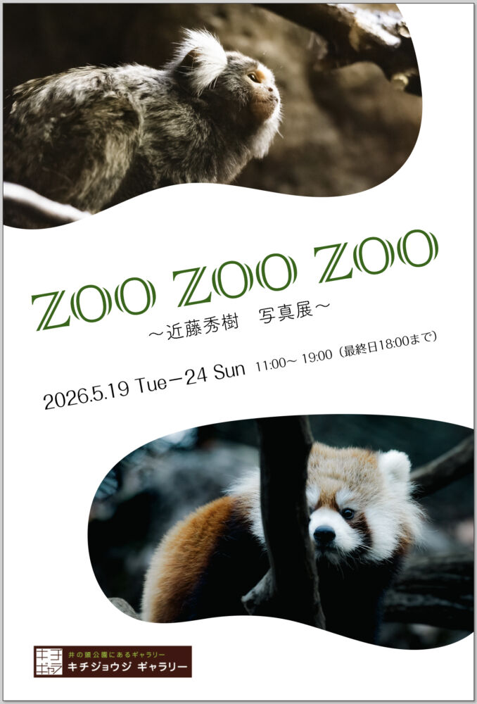 ZOO ZOO ZOO—近藤秀樹 写真展— 開催日 2026年5月19日(火)〜24日(日) 時間 11:00〜19:00(最終日18:00まで) 料金など 無料 会場 キチジョウジギャラリー〒181-0001 東京都三鷹市井の頭3-32-16 セブンスターマンション105R中央線・吉祥寺駅徒歩9分 京王井の頭線・井の頭公園駅徒歩1分 Web http://kichijojigallery.com/?p=12492