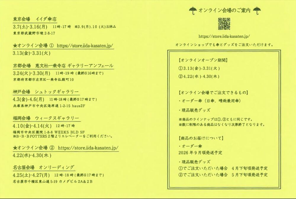 イイダ傘店 春の受注会 東京会場 開催日 2026年3月7日(土)〜16日(月) ※9日(月)10日(火)休み 時間 11:00〜17:00 会場 イイダ傘店〒180-0022 東京都武蔵野市境2-8-17 Web http://iida-kasaten.jp/archives/8315 Instagram @iidakasaten