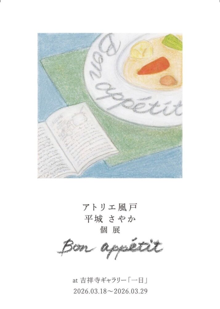 アトリエ風戸 平城さやか 個展 Bon appetit 開催日 2026年3月18日(水)〜29日(日) ※火曜定休 時間 12:00〜19:00(最終日17:00まで) 会場 一日〒180-0004 東京都武蔵野市吉祥寺本町2-1-3 石上ビル1F Web http://www.100hyakunen.com/news/ichinichi Instagram @saya_01life