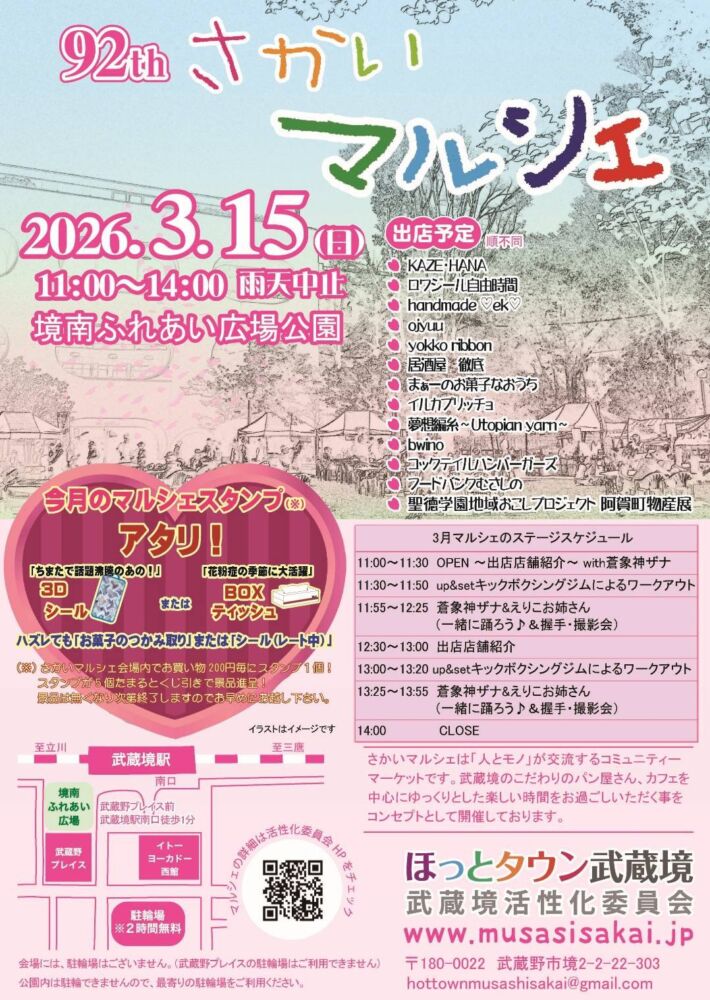 第92回 さかいマルシェ 開催日 2026年3月15日(日)※雨天中止 時間 11:00〜14:00 料金など 無料 会場 境南ふれあい広場公園〒180-0023 東京都武蔵野市境南町2-3 武蔵野プレイス前 主催 [主催]武蔵境活性化委員会 Web https://musasisakai.jp/ X @m_kasseika Instagram @634sakai
