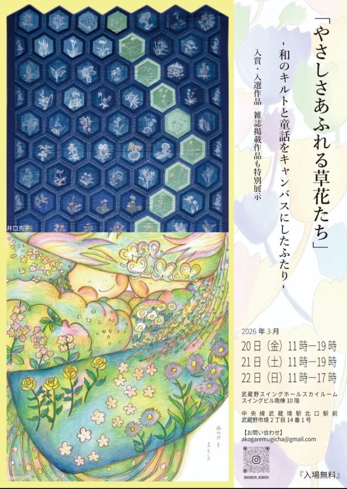 やさしさあふれる草花たち—和のキルトと童画をキャンバスにしたふたり— 開催日 2026年3月20日(金・祝)〜22日(日) 時間 11:00〜19:00(最終日17:00まで) 料金など 会場:武蔵野スイングホール10階 スカイルーム第1 会場 武蔵野スイングホール〒180-0022 東京都武蔵野市境2丁目14番1号 スイングビル(北棟2階:スイングホール) Instagram @momori_nomori